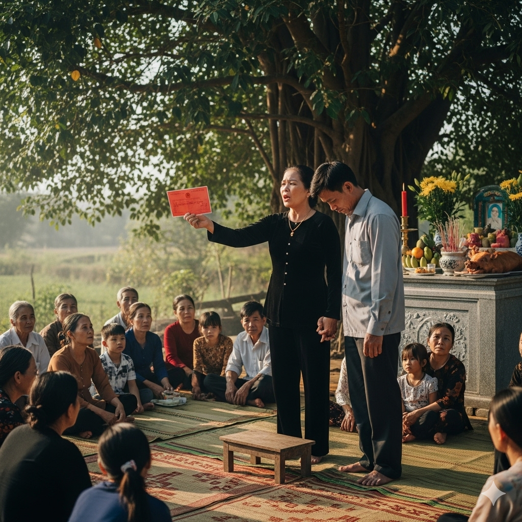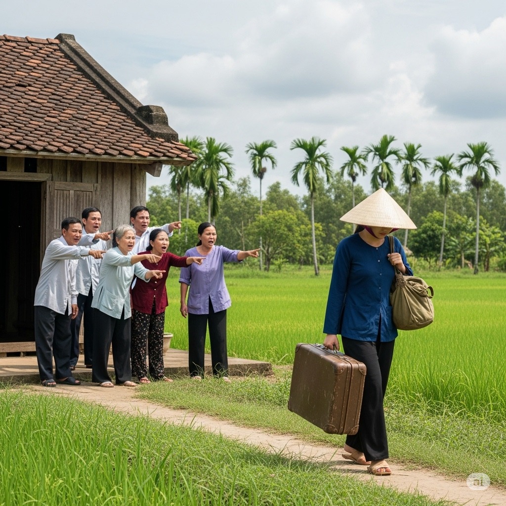 Làng Đông, một buổi chiều tháng bảy nắng gắt, nhà bà Cúc lại dậy sóng. Cánh cổng gỗ cũ kỹ, nơi đã gắn bó với chị Mai suốt hơn chục năm nay, bỗng trở nên xa lạ đến lạ thường. Bà con hàng xóm đứng dòm ngó, xì xào bàn tán, thương cho người đàn
